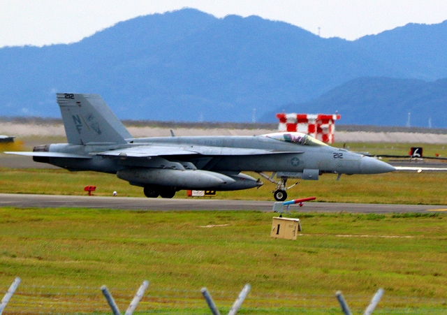 米海軍艦載機 F/A-18E スーパーホーネット 戦闘攻撃機(岩国基地)、NF、212番機が着陸 |