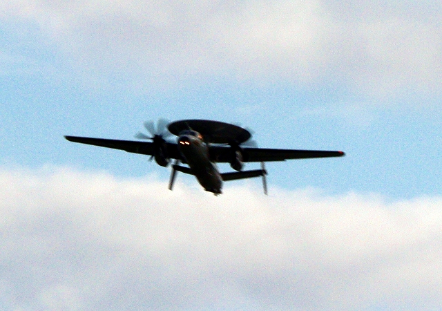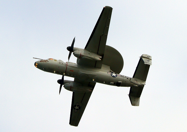 米海軍艦載機 E-2D アドヴァンスド・ホークアイ 早期警戒機(岩国基地)、602番機が離陸 |