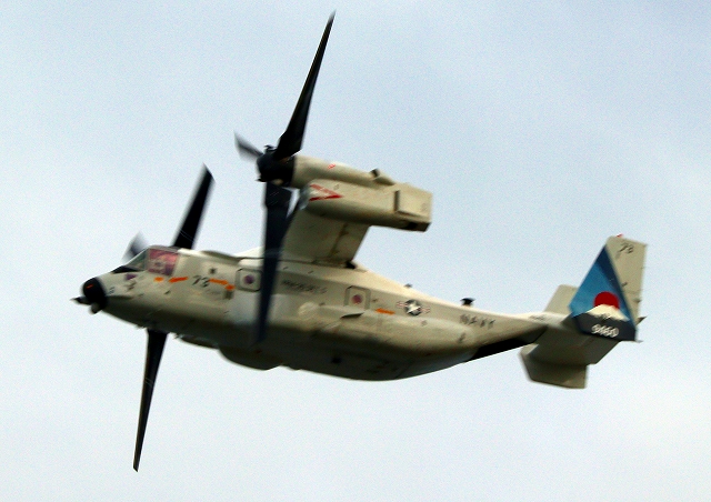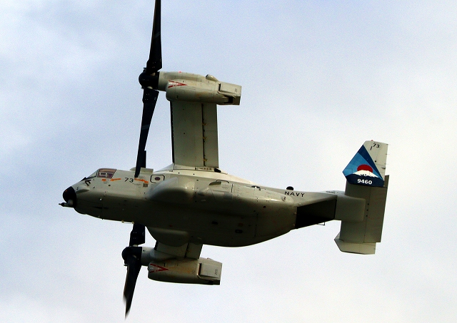 米海軍艦載機 CMV-22B オスプレイ(岩国基地)、73-9460番機が旋回 固定翼モード |