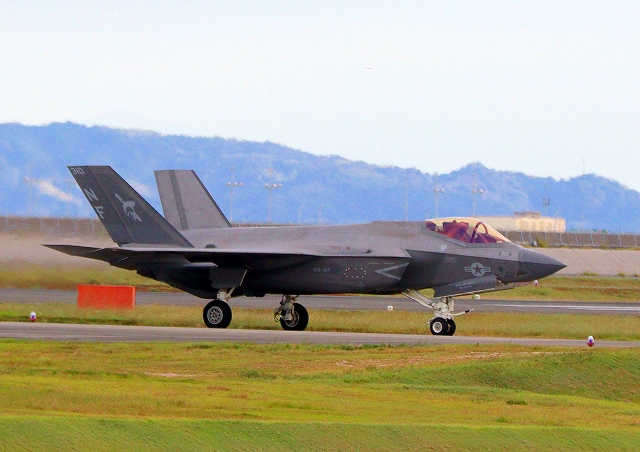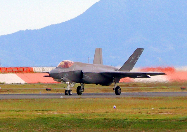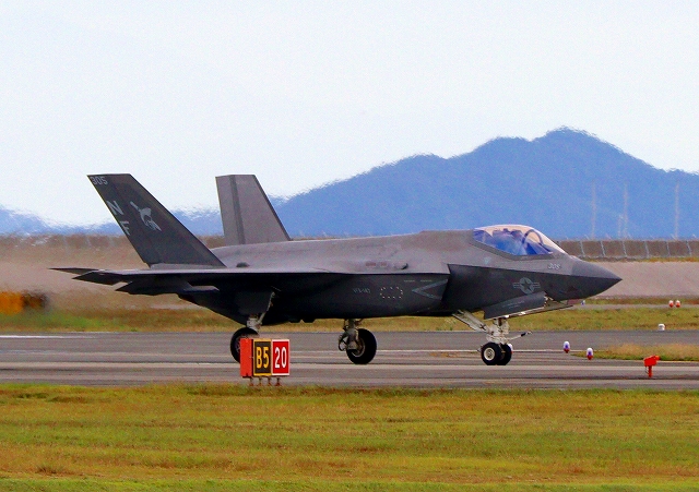 米海軍艦載機 F-35C ライトニングⅡ ステルス戦闘機(岩国基地)、NF、305番機が着陸 14時51分に離陸した機。1時間21分の飛行でした。 |