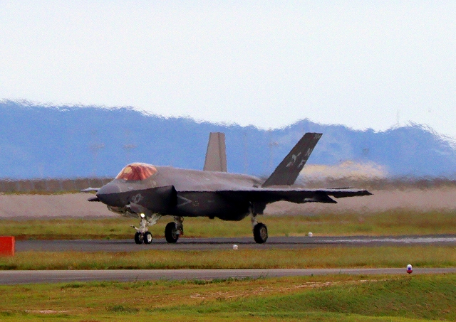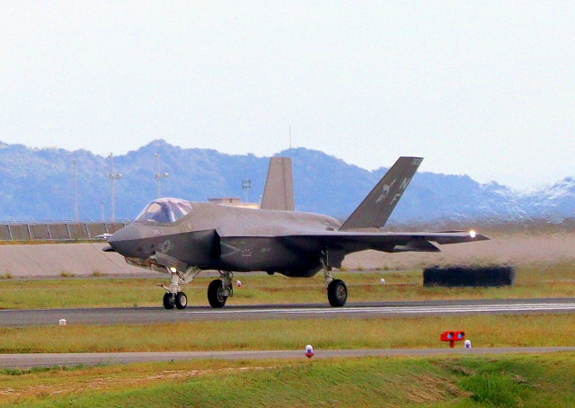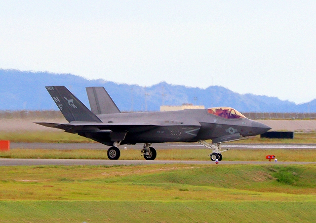 米海軍艦載機 F-35C ライトニングⅡ ステルス戦闘機(岩国基地)、NF、310番機が着陸 14時51分に離陸した機。1時間21分の飛行でした。 |