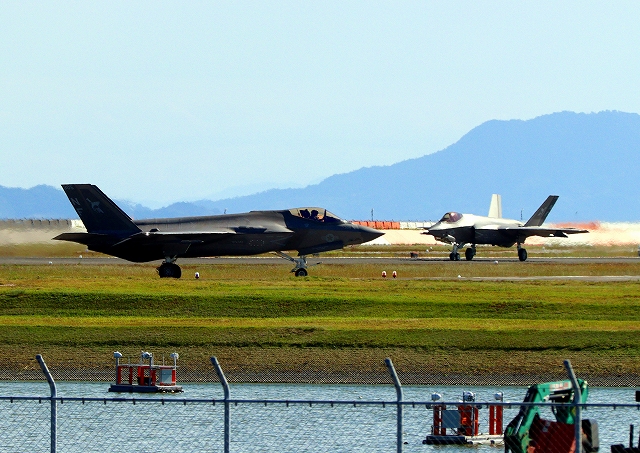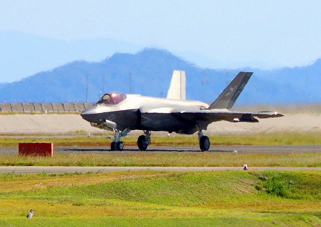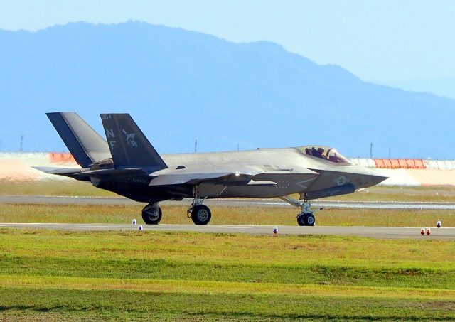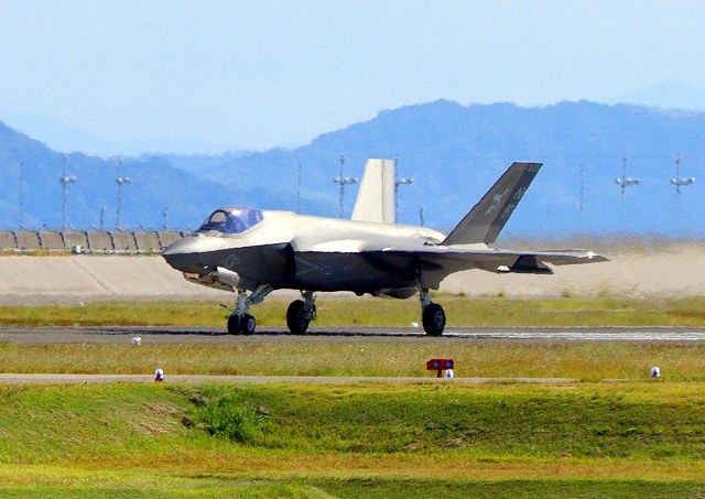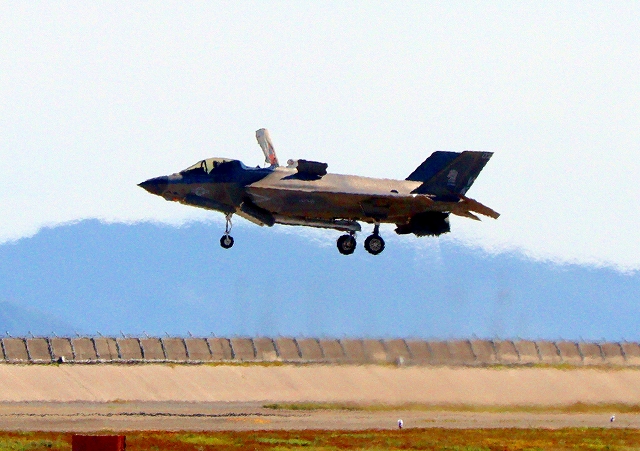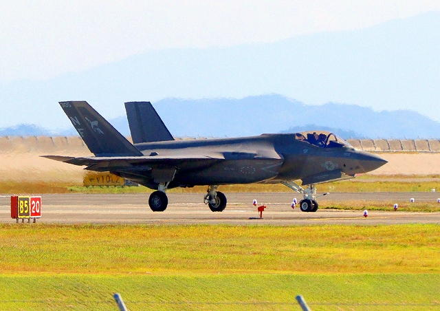 米海兵隊 F-35B ライトニングⅡ ステルス戦闘機(岩国基地)、VK、03番機は垂直着陸パッドの上に着陸 |