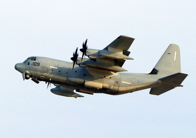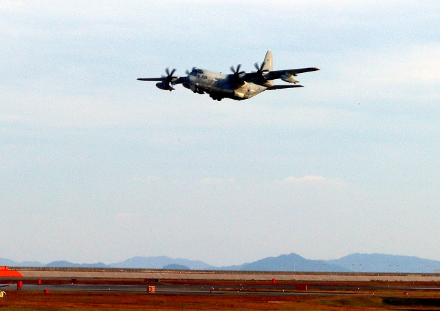 米海兵隊 KC-130J 空中給油機 スーパーハーキュリーズ(岩国基地)、QD 7109番機が離陸 |