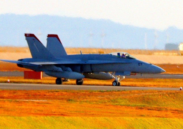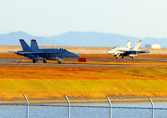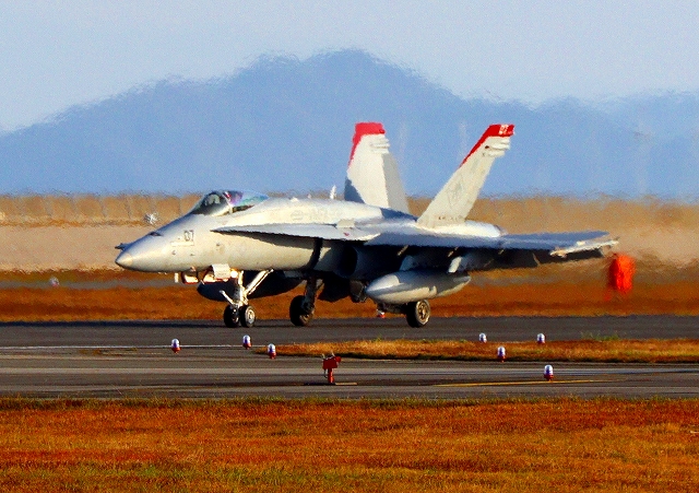 米海兵隊 F/A-18C ホーネット 戦闘攻撃機(岩国基地)、WT、07番機が着陸 14時30分に離陸した機。1時間33分の飛行でした。 |