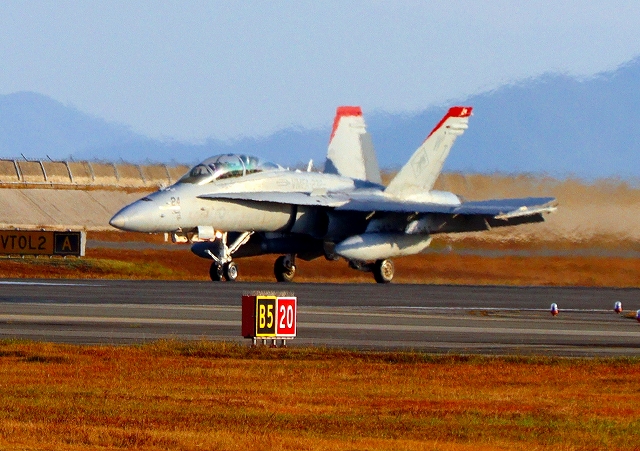 米海兵隊 F/A-18D ホーネット 戦闘攻撃機(岩国基地)、WT、20番機が着陸 14時29分に離陸した機。1時間34分の飛行でした。 |