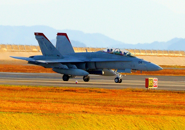 米海兵隊 F/A-18D ホーネット 戦闘攻撃機(岩国基地)、WT、24番機が着陸 14時30分に離陸した機。1時間33分の飛行でした。 |