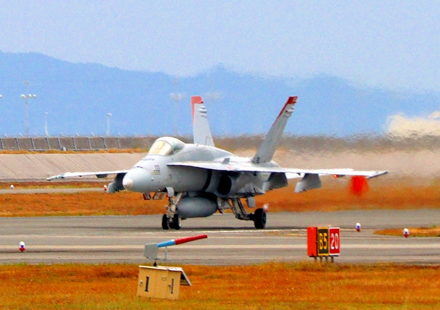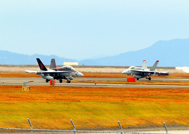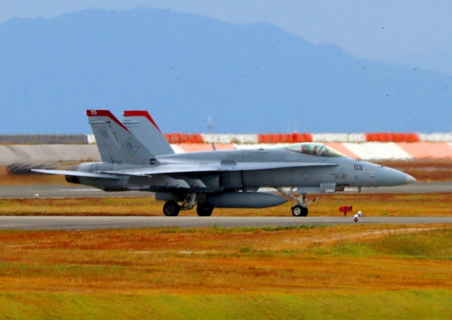 米海兵隊 F/A-18C ホーネット 戦闘攻撃機(岩国基地)、WT、03番機が着陸 |