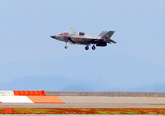 米海兵隊 F-35B ライトニングⅡ ステルス戦闘機(岩国基地)、VK、06番機は垂直着陸パッドの上に着陸 |