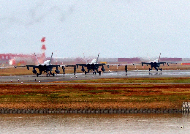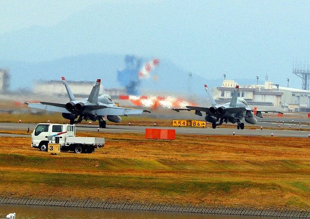 米海兵隊 F/A-18C ホーネット 戦闘攻撃機(岩国基地)、WT、01番機が帰還、着陸