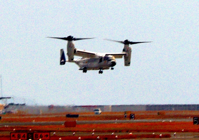 米海軍艦載機 CMV-22B オスプレイ(岩国基地)、71-9456番機が着陸 14時38分に離陸した機。20分間の飛行でした。 |