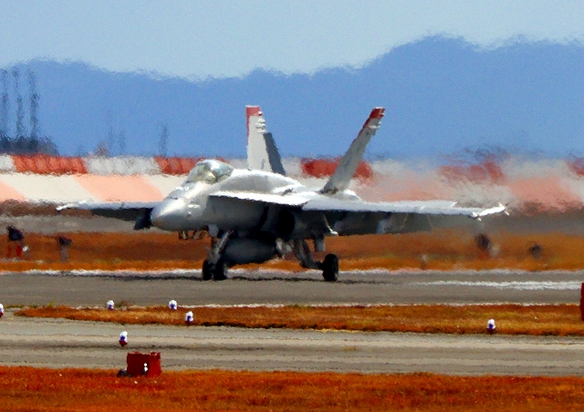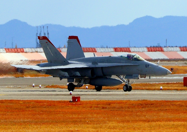 米海兵隊 F/A-18C ホーネット 戦闘攻撃機(岩国基地)、WT 07番機が着陸 |