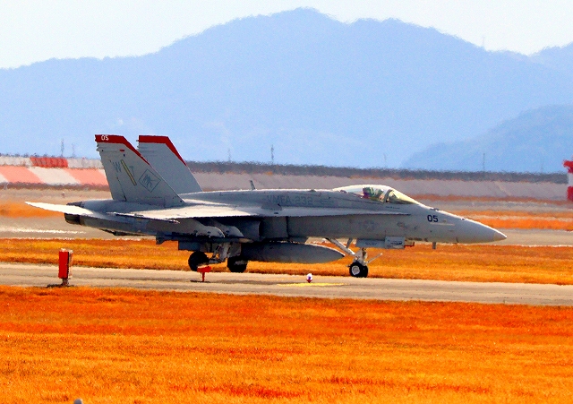 米海兵隊 F/A-18C ホーネット 戦闘攻撃機(岩国基地)、WT 05番機が着陸 |