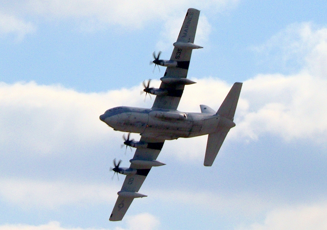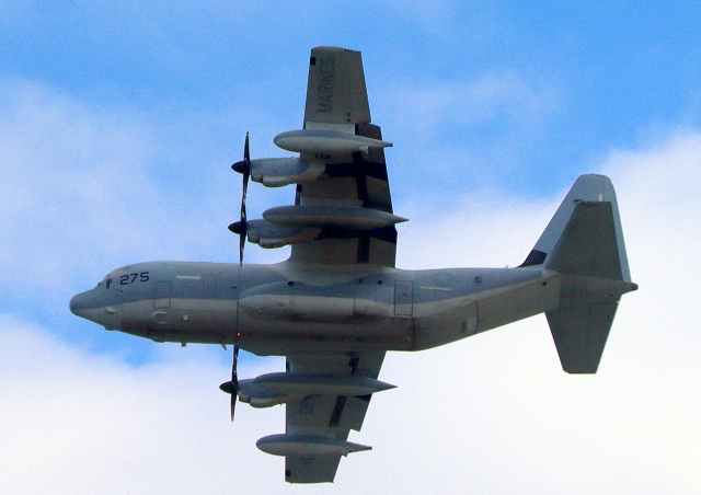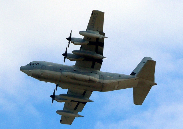 米海兵隊 KC-130J 空中給油機 スーパーハーキュリーズ(米本土海兵隊基地)、QB 0275番機が旋回 |