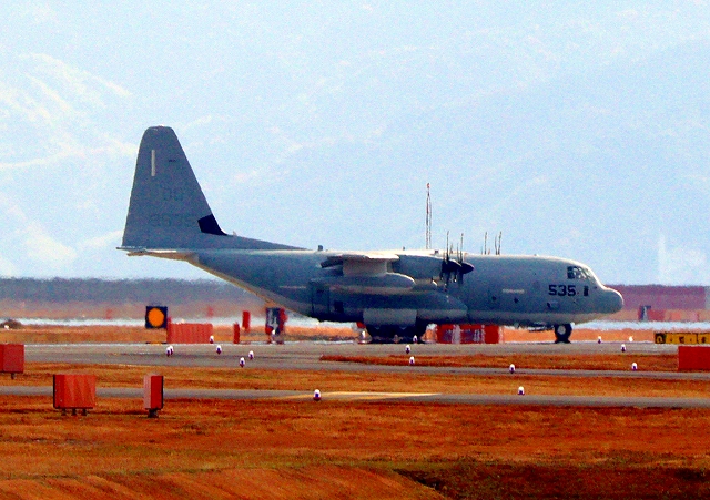 米海兵隊 KC-130J 空中給油機 スーパーハーキュリーズ(岩国基地)、QD 9535番機が着陸 |