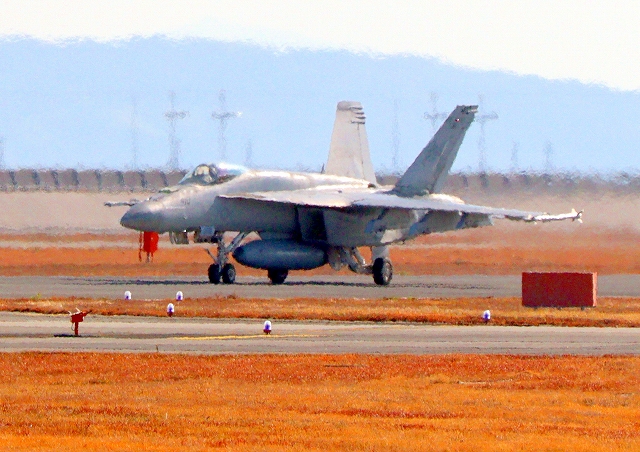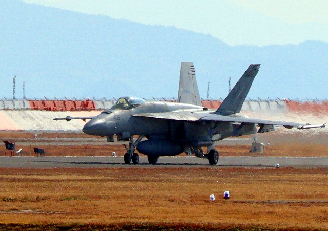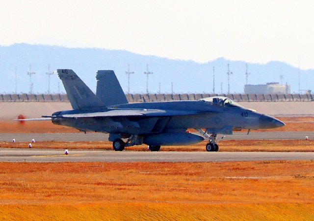 米海軍艦載機 F/A-18E スーパーホーネット 戦闘攻撃機(岩国基地)、NF、401番機が着陸 |