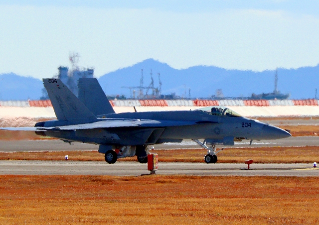 米海軍艦載機 F/A-18E スーパーホーネット 戦闘攻撃機(岩国基地)、NF、204番機が着陸 |