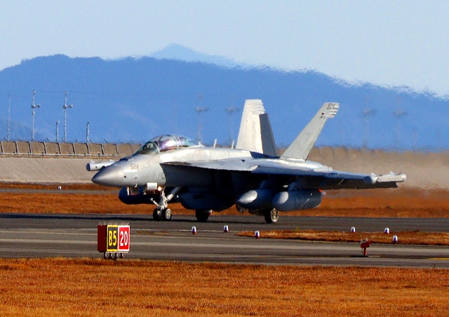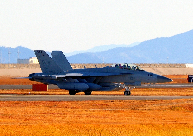 米海軍艦載機 EA-18G グラウラー 電子戦戦闘攻撃機(三沢基地)、NL、525番機が着陸 13時49分に離陸した機。1時間24分の飛行でした。 |