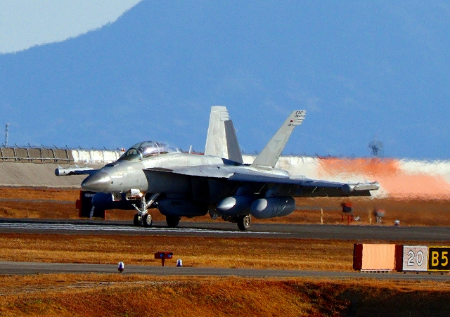 米海軍艦載機 EA-18G グラウラー 電子戦戦闘攻撃機(三沢基地)、NL、524番機が着陸 13時49分に離陸した機。1時間23分の飛行でした。 |