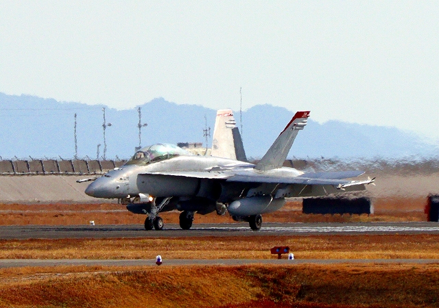 米海兵隊 F/A-18D ホーネット 戦闘攻撃機(岩国基地)、WT 24番機が着陸 |