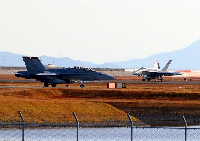 米海兵隊 F/A-18D/C ホーネット 戦闘攻撃機(岩国基地)、WT 24番機、07番機が着陸 |