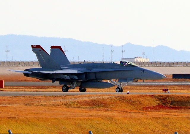 米海兵隊 F/A-18C ホーネット 戦闘攻撃機(岩国基地)、WT 07番機が着陸 |