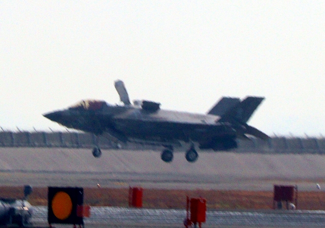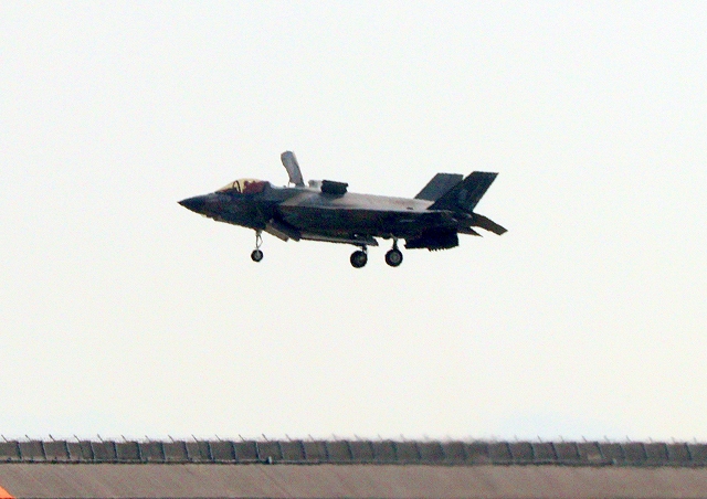 米海兵隊 F-35B ライトニングⅡ ステルス戦闘機(岩国基地)、VK、02番機は垂直着陸パッドの上でホバリング |
