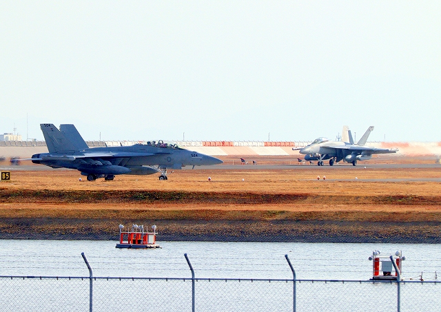 米海軍艦載機 EA-18G グラウラー 電子戦戦闘攻撃機(三沢基地)、NL、524番機、523番機が2機編隊で帰還 |