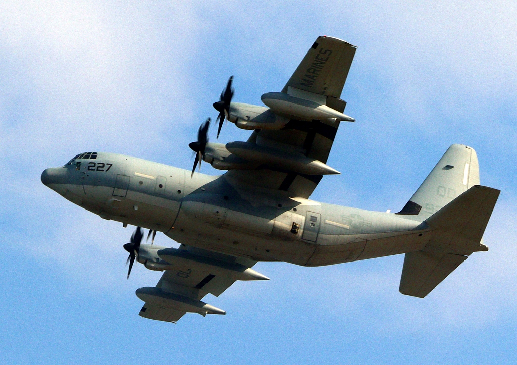 米海兵隊 KC-130J 空中給油機 スーパーハーキュリーズ(岩国基地)、QD 9227番機が離陸