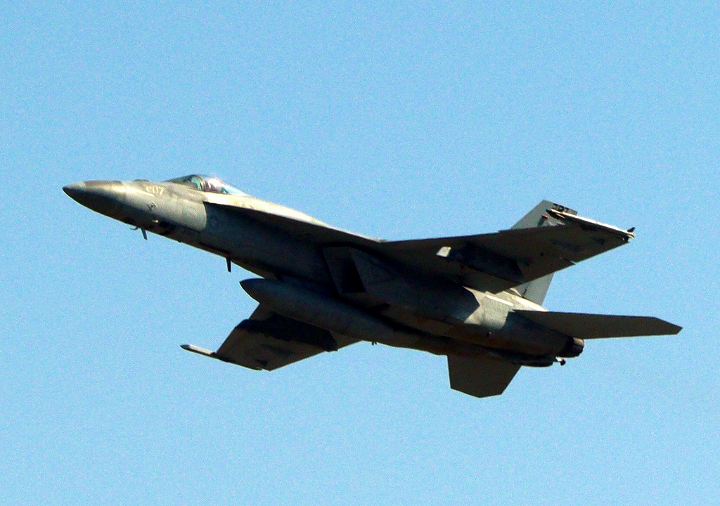 米海軍艦載機 F/A-18E スーパーホーネット 戦闘攻撃機(岩国基地)、NF、207番機が離陸
