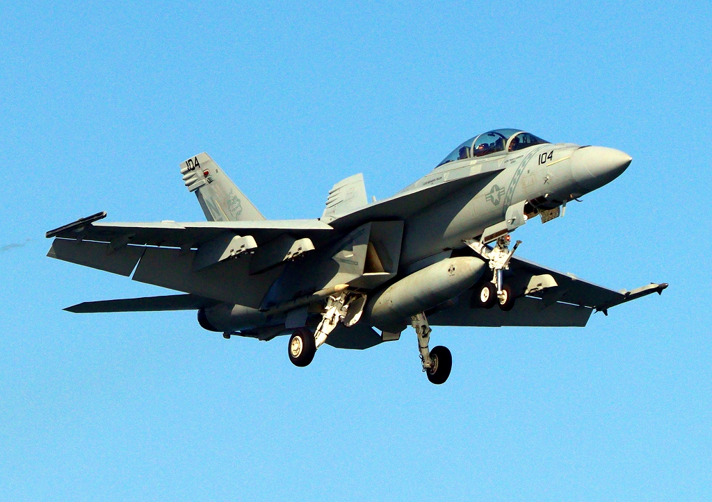 米海軍艦載機 F/A-18F スーパーホーネット 戦闘攻撃機(岩国基地)、NF、104番機が帰還、着陸