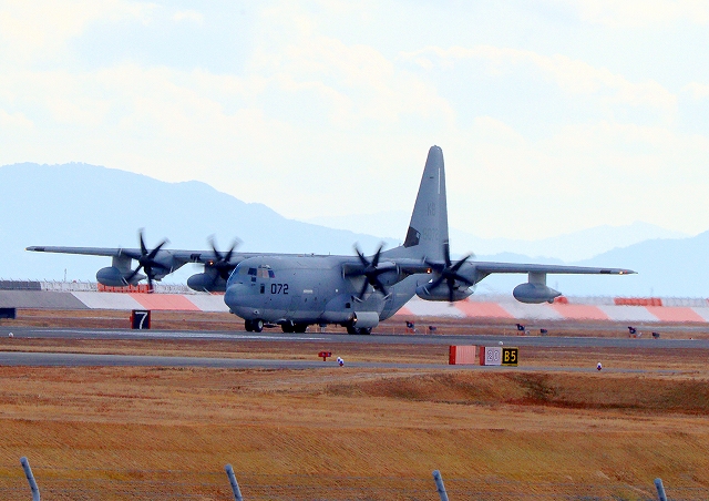 米海兵隊 KC-130J 空中給油機 スーパーハーキュリーズ(岩国基地)、QD 8072番機が着陸 |
