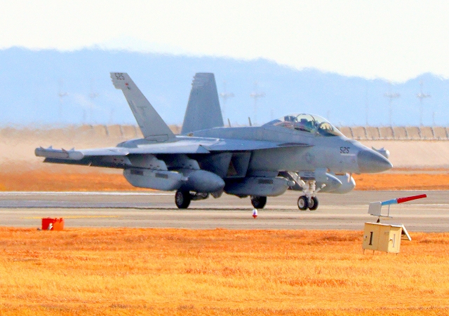 米海軍艦載機 EA-18G グラウラー 電子戦戦闘攻撃機(三沢基地)、NL、525番機が着陸 12時37分に離陸した機。1時間33分の飛行でした。 |