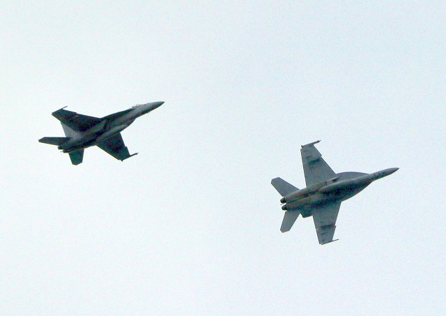 米海軍艦載機 F/A-18E スーパーホーネット 戦闘攻撃機(岩国基地)、NF、407番機、405番機が2機編隊で帰還 |
