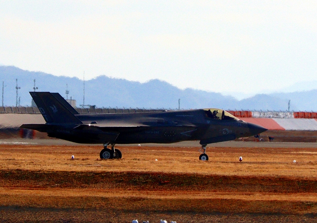 米海兵隊 F-35B ライトニングⅡ ステルス戦闘機(岩国基地)、DT、32番機が着陸 13時08分に離陸した機。1時間14分の飛行でした。 |