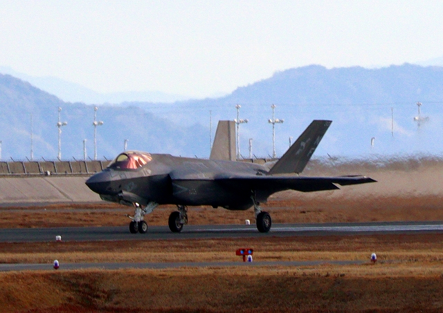 米海兵隊 F-35B ライトニングⅡ ステルス戦闘機(岩国基地)、DT、22番機が着陸 13時08分に離陸した機。1時間14分の飛行でした。 |