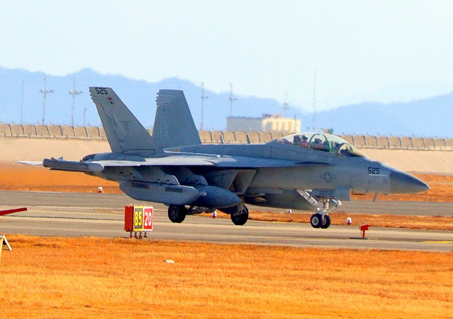 米海軍艦載機 EA-18G グラウラー 電子戦戦闘攻撃機(三沢基地)、NL、525番機が着陸 12時52分に離陸した機。1時間39分の飛行でした。 |