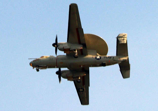米海軍艦載機 E-2D アドヴァンスド・ホークアイ 早期警戒機(岩国基地)、604番機が離陸 |