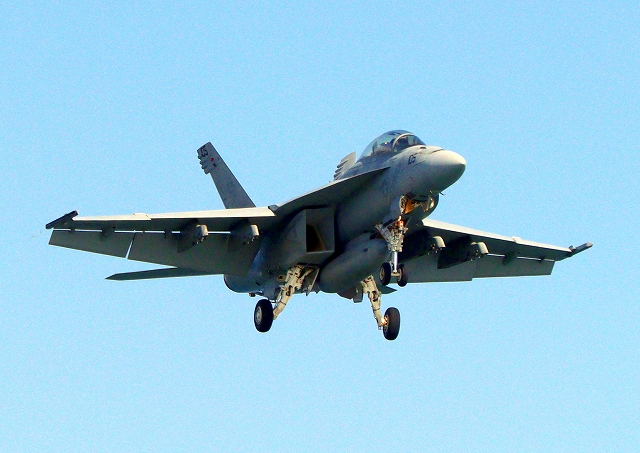 米海軍艦載機 F/A-18F スーパーホーネット 戦闘攻撃機(岩国基地)、NF、105番機が着陸 |