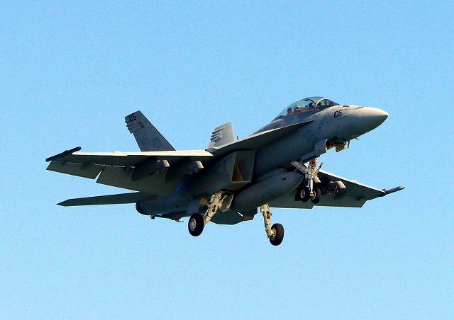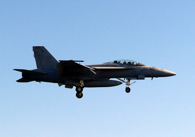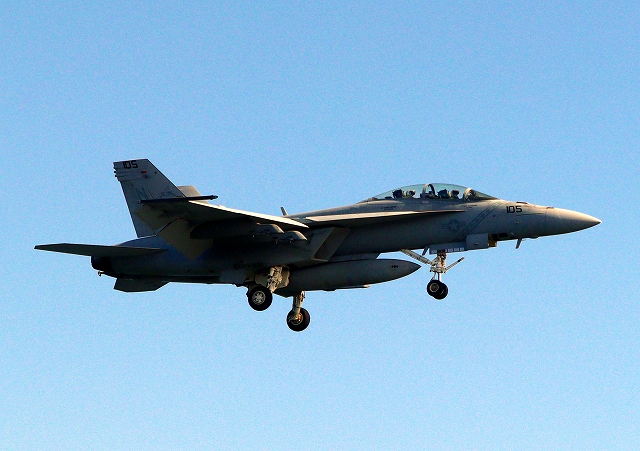 米海軍艦載機 F/A-18F スーパーホーネット 戦闘攻撃機(岩国基地)、NF、105番機が帰還 |