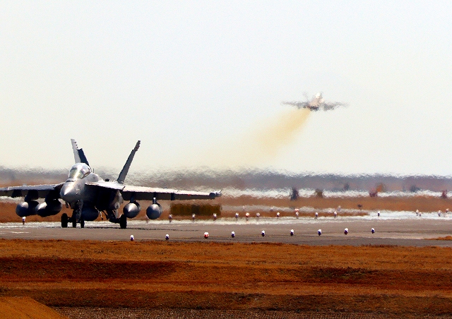 米海軍艦載機 EA-18G グラウラー 電子戦戦闘攻撃機(三沢基地)、NL、521番機が離陸 下に見えるは、522番機、525番機 |