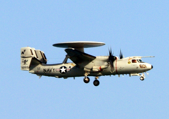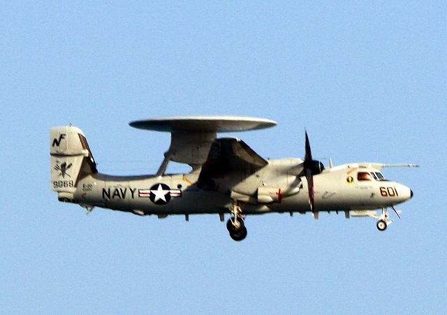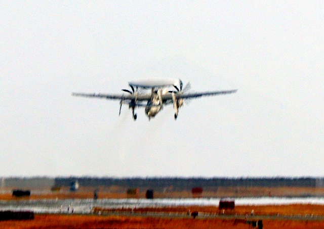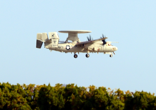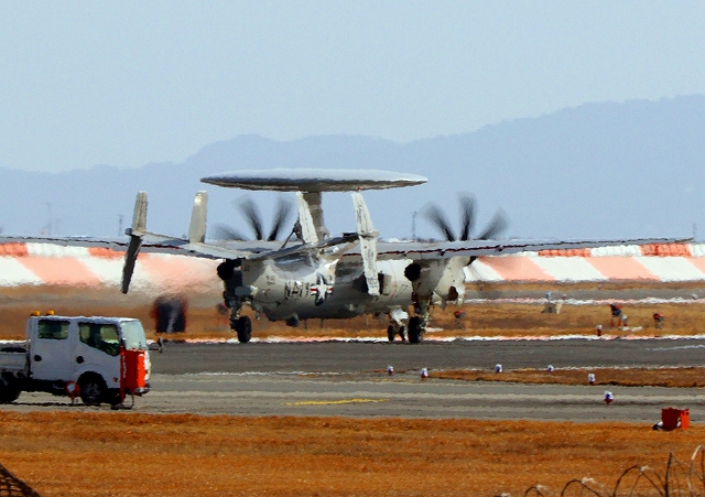 米海軍艦載機 E-2D アドヴァンスド・ホークアイ 早期警戒機(岩国基地)、604番機が離陸 |