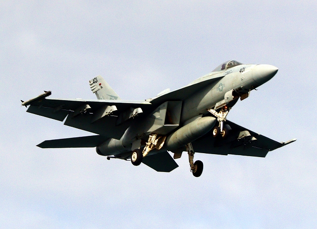 米海軍艦載機 F/A-18E スーパーホーネット 戦闘攻撃機(岩国基地)、NF、NA 401番機が着陸