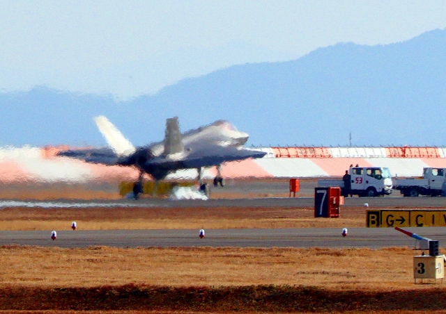 米海軍艦載機 F-35C ライトニングⅡ ステルス戦闘機(岩国基地)、NF、302番機はアレスティング・フックを引っかけて着陸
