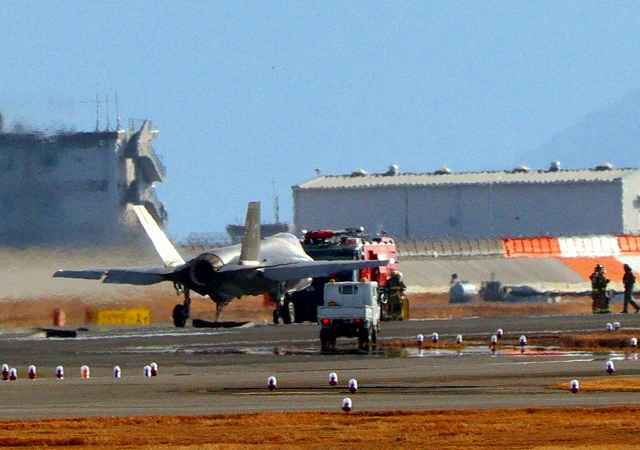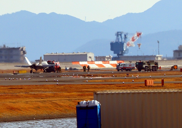 米海軍艦載機 F-35C ライトニングⅡ ステルス戦闘機(岩国基地)、NF、302番機に緊急車両