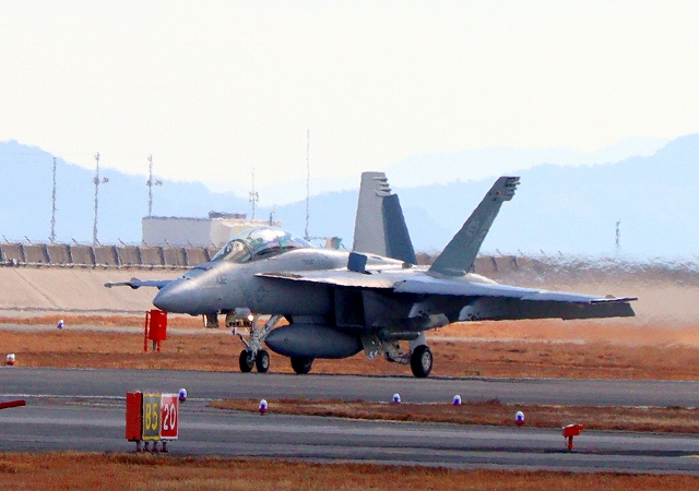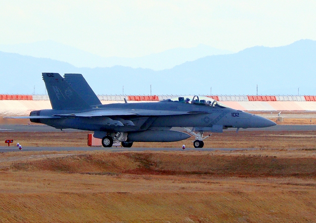 米海軍艦載機 F/A-18F スーパーホーネット 戦闘攻撃機(岩国基地)、NF、102番機が着陸 |