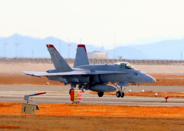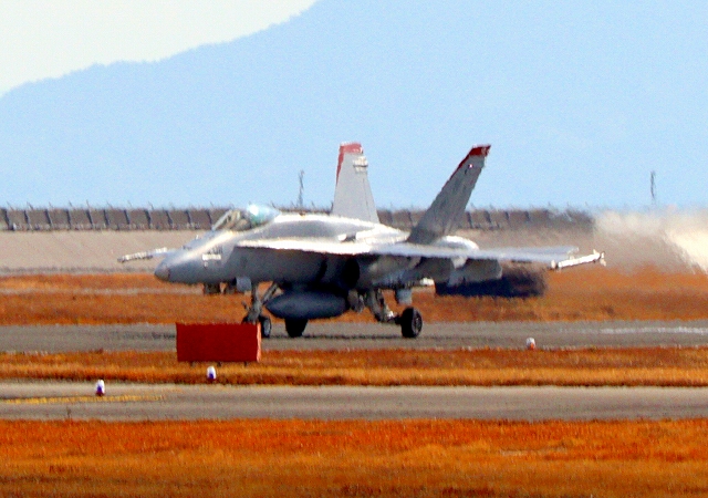 米海兵隊 F/A-18C ホーネット 戦闘攻撃機(岩国基地)、WT 08番機が着陸 |