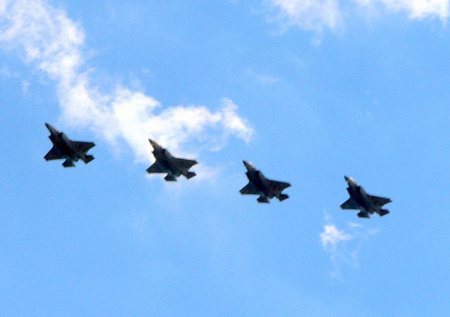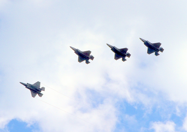 米海兵隊 F-35B ライトニングⅡ ステルス戦闘機(岩国基地)、4機 この後、この4機が北と南の垂直着陸パッドの上でホバリング、着陸 さらにホーネット C・WT、6機ぐらいが、降りてきたのですが、写真で説明するのは困難。割愛します。 |